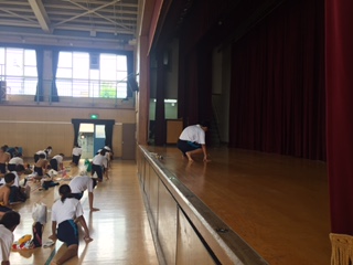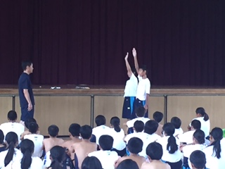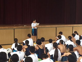 水泳大会は雨のため体育館での開会式となりましたが、パワーいっぱいの声が響きました。