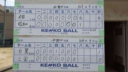 5回戦を1-0で三国中学校に勝利しました(写真上)。これで大阪市ベスト4。準決勝-決勝は9月23日(土)舞洲球場で行われます。準決勝は第2試合目10時