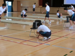 体育ではマット運動の見本演技をプロジェクターで見たあと、タブレットのカメラ機能を活用して、自分の動きを動画で確認しながら練習をしました。