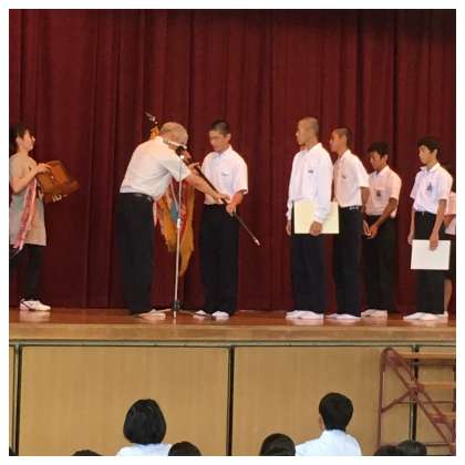全校集会では生徒会の意見BOXの取り組みが紹介された他、水泳部、男子バスケットボール部、野球部の表彰がありました。
