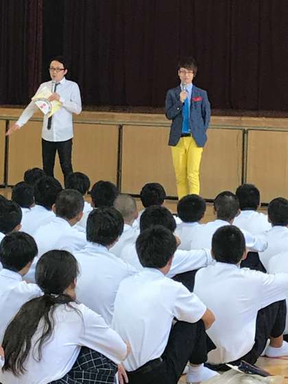 今日4限、松竹芸能の【じなんぼ〜いず】さんが2年生対象に笑育の授業をしてくださいました。そしてサプライズ発表が…。