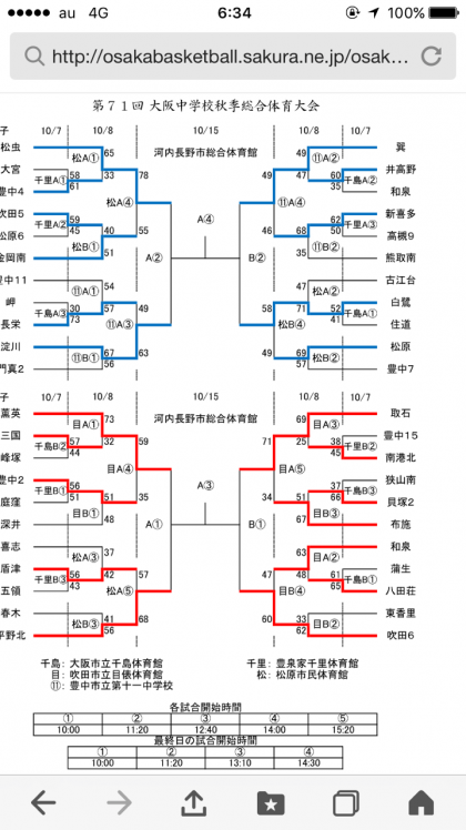 会場→河内長野市総合体育館 試合→第二試合11時20分開始予定、勝てば午後に決勝。