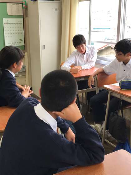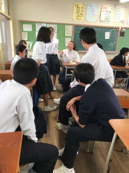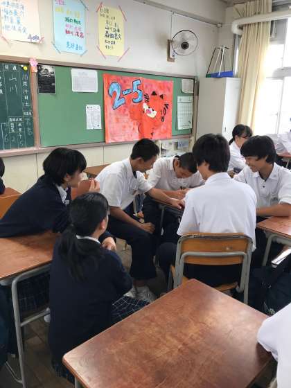 今日の土曜授業。2年生は1時間目、各教室で笑育(コント練習)に取り組んでいます。