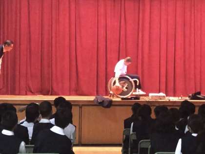 実際のパラリンピックの映像も見せていただき、その躍動感に生徒からも「すごい」という声が上がりました。日常用と競技用の義足も見せていただき、「バレーボールするときにバレーシューズを履くのと同じ」と分かりやすく説明してくださいました。車いすバスケットボール用の車いすにも数名のせていただきました。壁に激突してしまったり、転がったボールを拾い上げることができなかったりと、車いすを操作しながらボールを扱う難しさに苦戦していました。