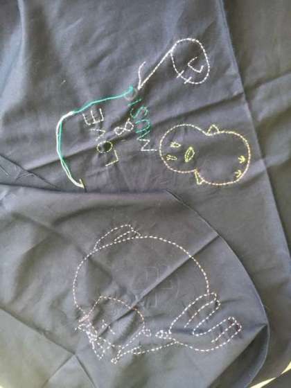 3年生家庭科で刺し子の座布団カバーを作っています。だいぶ絵柄がわかるようになってきました。チクチク頑張って縫っています。完成が楽しみですね。