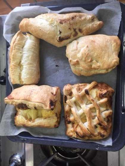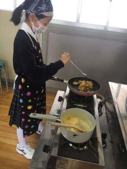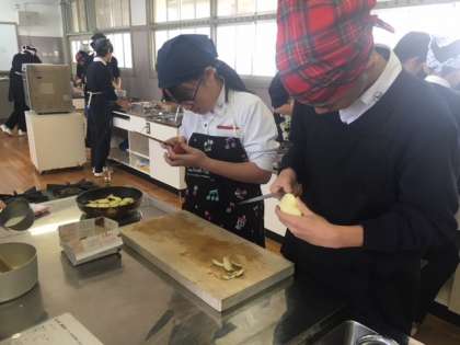 調理実習でアップルカスタードパイを作りました。悪戦苦闘しながらもりんごの皮むきを全員して、カスタードクリームを作り、パイ生地に挟みました。パイ生地に挟む時は思い思いの形を作り、焼きたてアツアツをいただきました。