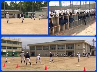 野球部 ベースランニング、キャッチボール…1年生も頑張っています。カバンや道具の整理整頓ばっちりです!