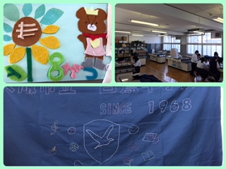 家庭科部 「先輩たちは1:30頃に来ます!」1年生が元気に教えてくれました。50周年に向けての旗の刺繍も進んでいます!