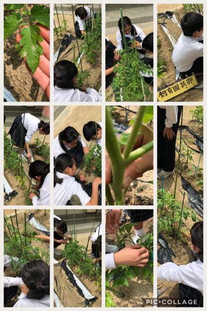 今日はトマトの摘芽をしました。美味しいトマト(桃太郎)が実るための必須の活動です。途中から部員もわき芽の見分け方をマスターしてめきめき上達してきました。