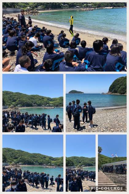 綺麗な海に無事到着しました。諸注意中を聞いてます。この後、クラス写真、昼食となります。