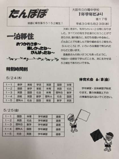 たんぽぽ通信を確認して、時間割を合わせましょう。テスト返却が終わるまで、問題用紙を持ってくる習慣を今後つけていきましょう♪特別時間割となります。今日は一泊移住の疲れを取って明日からの授業に備えましょう。