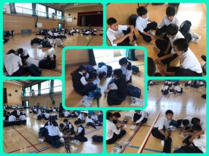 体育館で、民泊班ごとに分かれて、振り返りをしました。