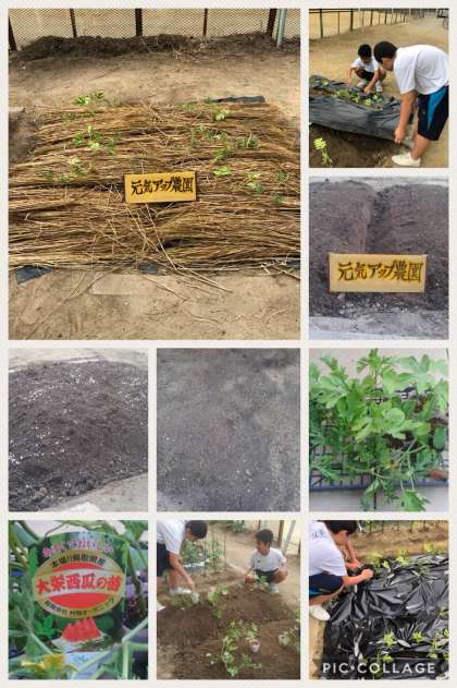 岩盤のような土から畑に、そしてスイカの苗を8つ寄贈いただき元気アップ農園が誕生しました。現役の飼育園芸部員とOGも参加しての共同作業です。白鷺中に来校された際は是非ご覧ください。
