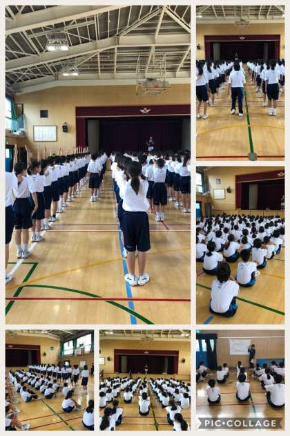 雨天のため、運動場の状態が悪く、体育館で3・4限、体育大会の1年学年練習が行われました。雨天の場合も体育館で学年練習はありますので、次回は体操服忘れもなく、全員で練習し、本番の6月8日(金)の体育大会は、素晴らしいものに仕上げていきましょう。