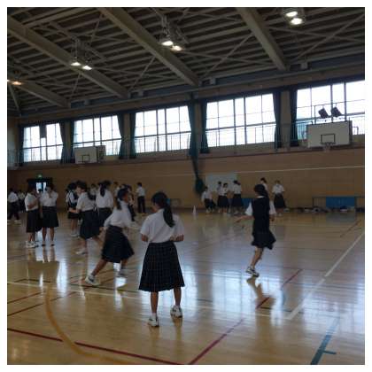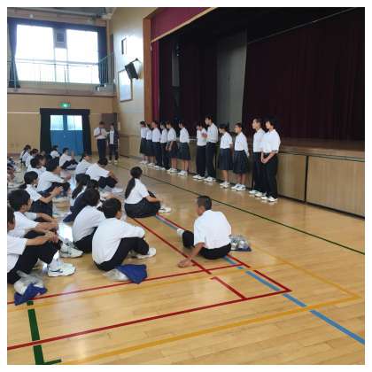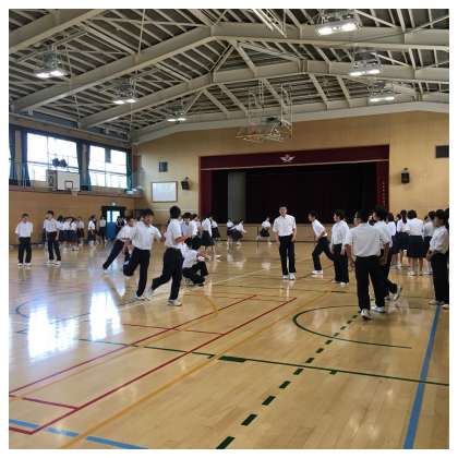 その後、体育大会の団対抗リレーに出場する生徒12名が『おに』となって『こおりおに』をしました。体育館の中なので、逃げられる範囲が限られていますが、必死に逃げ回り、追っかけていました。
