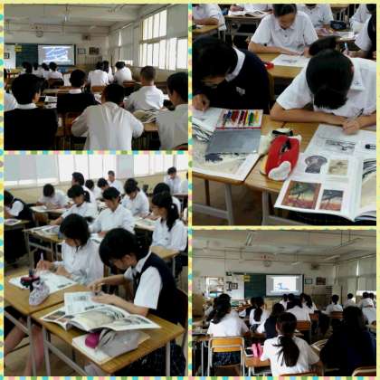 はじめは「えーーーー!切り絵したかった」と今、頑張っている制作をしたかった声もあがりましたがそこは3年生です!サッと自由なメンバーと席を決め、会話しながら日本文化についてと浮世絵について鑑賞しました。