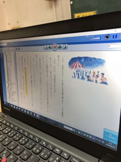 チャレンジルームの授業では、ディスレクシアの生徒の為にデイジー教科書を使っています。国語の 空中ブランコ乗りのキキ を学習しています。