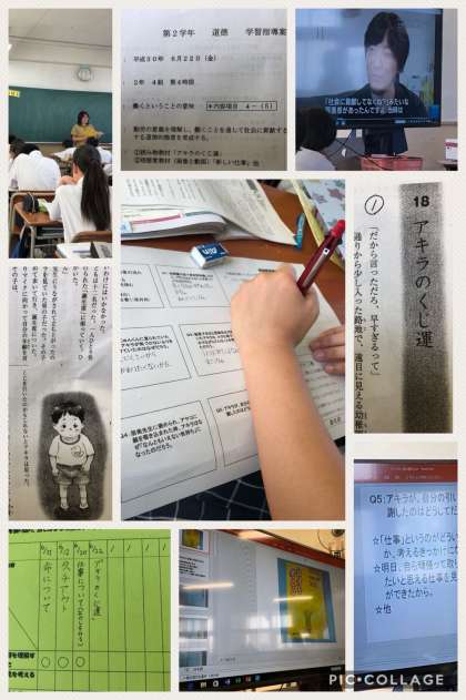 2年4組で四時間目に、働くということの意味と題して道徳の研究授業がありました。ユーチューバーからサッカー選手まで、様々な働く大人が紹介され、生徒も熱心に自分の将来について考えていました。