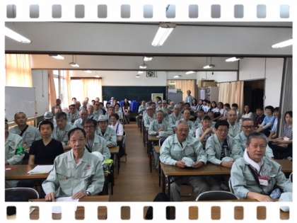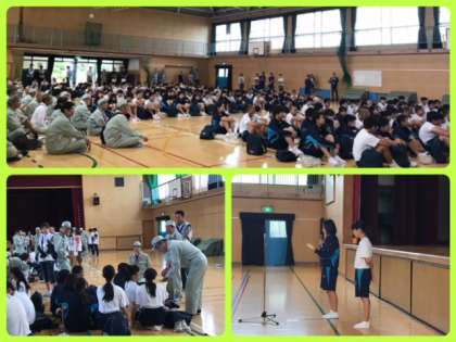 3年生の防災授業を支えてくださった方々との、朝の打ち合わせ風景です。皆様と大阪北部地震で亡くなられた方のご冥福を祈り、黙祷の後、校長先生からお話をいただきました。地域の防災リーダーさん、保護者の方々と授業の流れ、体験中の緊急時に備えて確認をし全体オリエンテーションの行われる体育館へ…