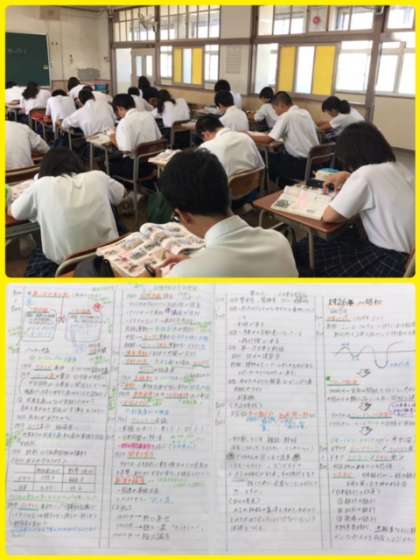 いよいよ水曜からは期末テスト。みんなの表情も、いつも以上に真剣です。写真は、3年生の社会科のノートです。ほとんどの人が、ただ板書を写すのではなく、自分の調べた事などを、どんどんノートに書き「世界で一冊だけのノート」を作成しています。このノートは卒業してからも、処分せずにずっと持っていてほしいな、と思っています。大人になってから、ふと疲れた時に、タイムスリップできる素敵な道具の1つにきっとなると思います。