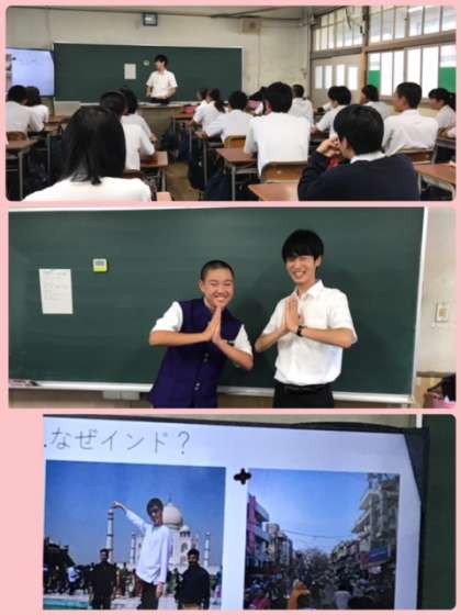 今日の3年生社会科の授業では、最近、インドにホームステイに行って来た、大阪教育大学の学生さんに来てもらい、出前授業をしてもらいました。インドでの生活をパワーポイントを使いながら、紹介、たくさんの写真や動画を見ながら、楽しく有意義な授業でした。中央の写真は、インドの服を着た3の2の男子です。