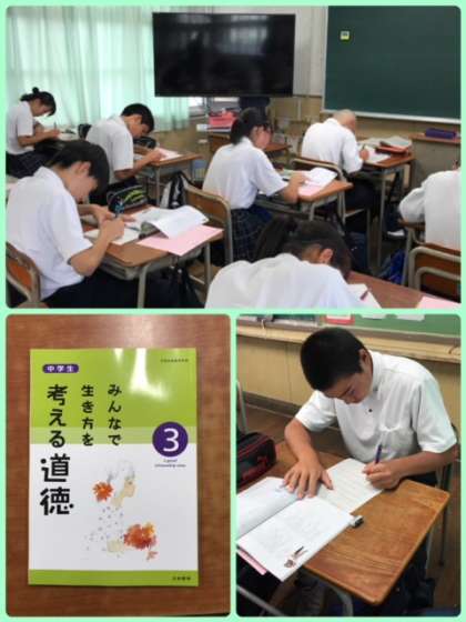 今日の5時間目、3年生は道徳の授業をしました。道徳は担任の先生だけではなく、学年のいろいろな先生が、それぞれの学級に入り、その取り組みを進めています。写真は今日「命のリレー」というテーマで沖縄戦を元に取り組みをした学級のものです。