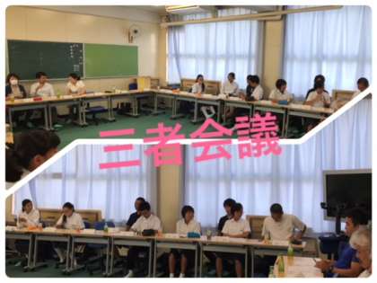 生徒代表(生徒会役員、防災ALT、元気UP、各団長)、保護者代表(PTA役員)、教職員代表(校長・教頭他)が一堂に会する三者会議が開催されました。この会議で提案されたことが実現されたことが多くあります。最近では団の勉強会がそうです。今回も団活動を含め多くの意見が出ました。