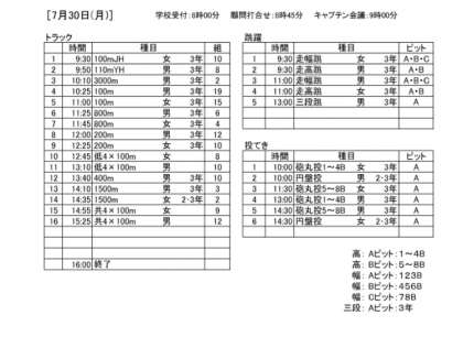 明日は添付写真の通り、競技ダイヤを大幅に変更し、3年生が出場する種目とリレーのみの実施になります。