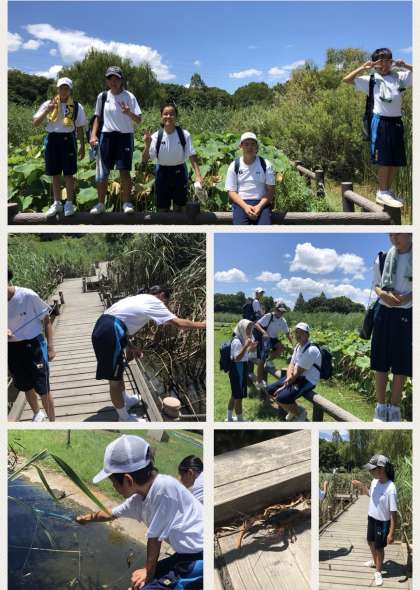 猛暑の中、体調不良になる生徒も無く、JR学研都市線の野崎駅から深北緑地公園にやってきました。紐にゲソの簡単な仕掛けで男子は最高15匹、女子が次いで11匹のザリガニをキャッチ&リリースして自然を満喫しました。