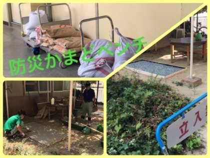 調理室前の廊下を歩いていて気がついている人もいると思いますが、藤棚の近くに立ち入り禁止の案内があります。その先を見ると作業途中の四角く囲まれた場所が2つ、災害時は炊き出し用のかまどとして使用し、普段はベンチとして使える防災かまどベンチの製作が始まりました。