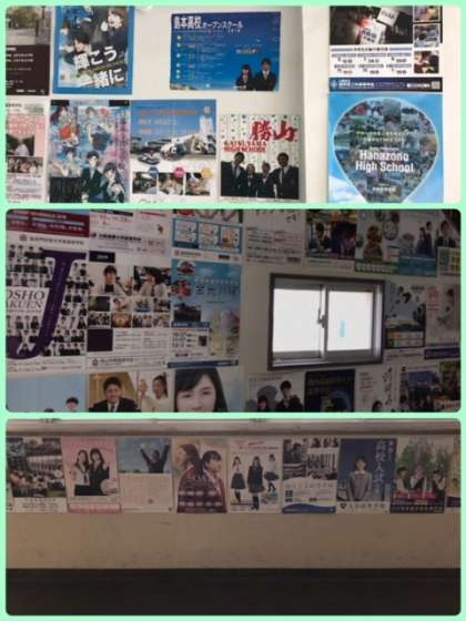 3年生の廊下に沢山の高校からのポスターが掲示してあります。一階は公立高校、二階に私立共学、三階が私立男子校・女子校を中心になっています。