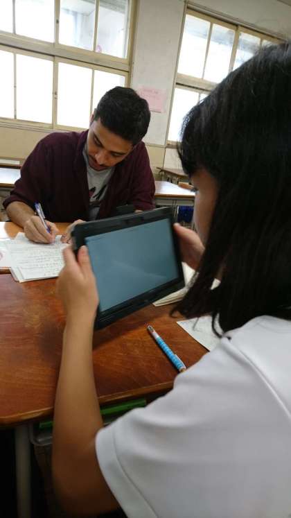 各部員が、それぞれテーマを決めて調べ、辞書やタブレットの翻訳アプリで英語にしています。