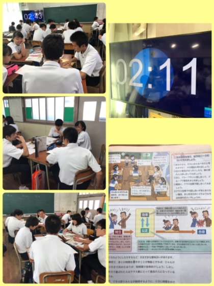 3年生社会科は公民の授業をしています。日本国憲法の学習の導入として、今日は班ごとで「効率と公正」の考え方を元に、意見を出し合いました。