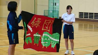 緑団遠足です。体育館に入って団旗の披露と全体写真を撮りました。
