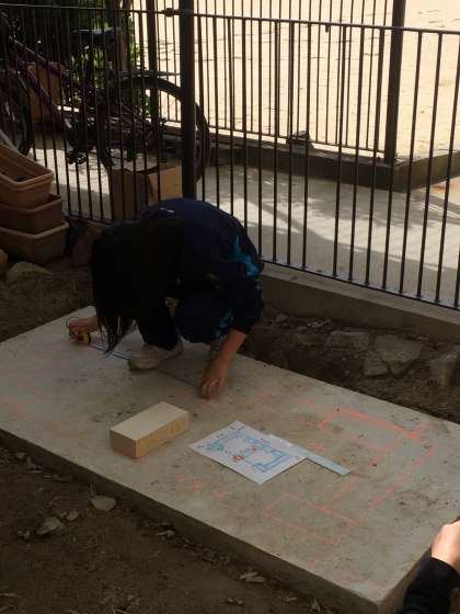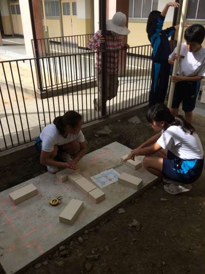 レンガをどのようにして組むのか、図案を書いて長さを測り、みんなで協力してレンガの一段目を作ることができました。