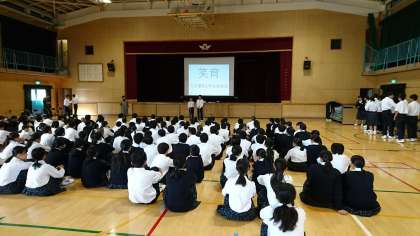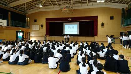 今日が笑育発表会です。今体育館で出入りの練習をしています。