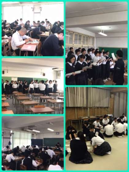 1週間の始まり、1時間目は英検IBAテストでした。そして2時間目、歌の練習やモザイク画作成中です。ちなみに今日は午前中、体育館で1年生が笑育発表会をしています。2年前が懐かしいですね。