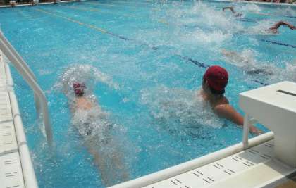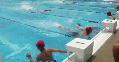 朝から快晴の空のもと、運動場でのラジオ体操。しっかり体を慣らして、いよいよプールサイドへ。