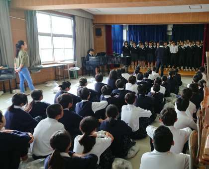 本日の団集会では、50周年式典に向けて3学年で歌の練習を行いました。