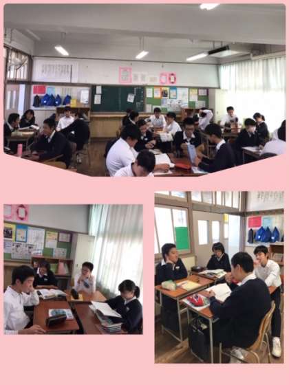 合唱コンクールと文化祭の間ですが、みんな授業も頑張っています。写真は国会について、班で学習している場面です。