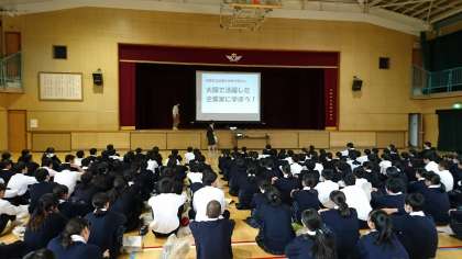 午後からは企業家ミュージアムの方の講話を体育館で聞いています。