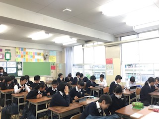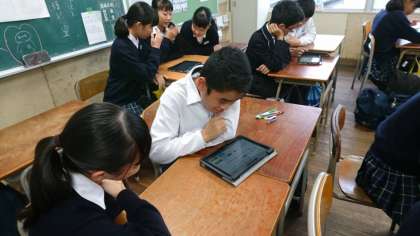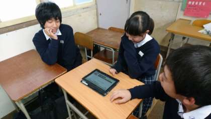 タブレットを配布し、1年ドリルを2年生と1年生のペアで行いました。5分ずつローテーションして相手を変えて、色々な人と交流しながら勉強しました。