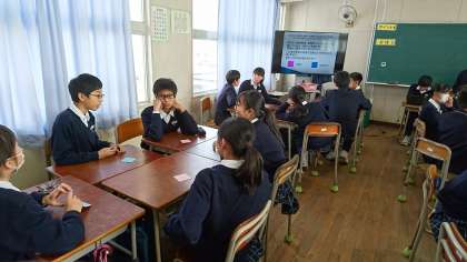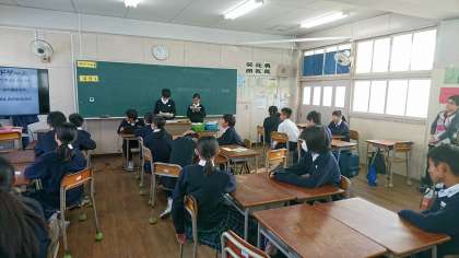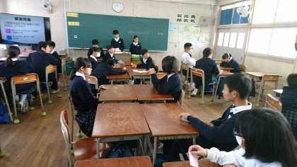 2時間目ははるかのひまわりの絵本で阪神大震災の学習に取り組みました。3時間目は防災ALTの生徒がゲームをしながら考える活動をしています。みんなが1日を通して震災のこと、防災のことを考えられたと思います。1年5組の様子です。