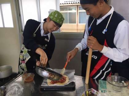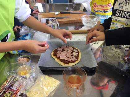 ピザとオレンジゼリーを作りました。ピザ生地をこね、ピザソースを作り、楽しくトッピングをしました。円形を人数等分するのが難しく、真剣にジャンケンをしてピザ争奪戦をしていました。オレンジゼリーを型から外すことも上手にできました。実習を通して、調理の楽しさ・協力の大切さを知り、日常食事を準備してくれている家族の方に感謝の気持ちを持てたようです。毎回のエプロンやふきんの準備のご協力ありがとうございました。