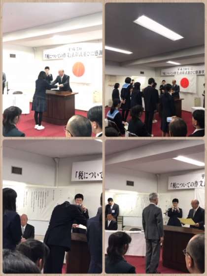 3年生社会科の夏休みの宿題で応募した「税についての作文」の表彰式が東住吉税務署でありました。納税貯蓄組合大阪府総連合会優秀賞・村井心音さん、東住吉納税貯蓄組合連合会長賞・大家真帆さん、東住吉納税協会長賞・広瀬夏樹君、受賞おめでとう。