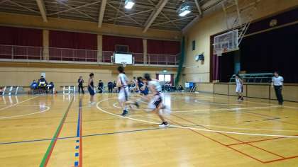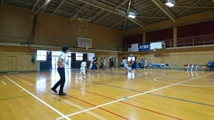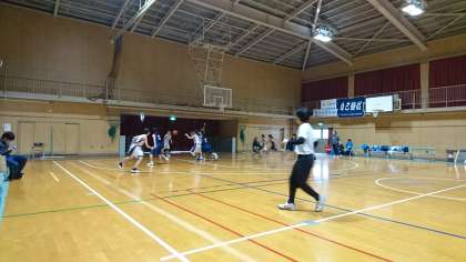 予選リーグ1試合目は東中と対戦して84対35で勝利しました。2試合目は第6試合で天満中と対戦です。