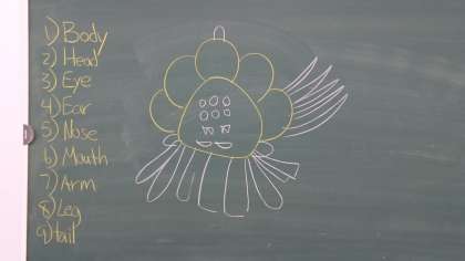 前半はC−netのブラン先生と英語を使って、体の部分と数を聞き取り「モンスター描き」をしました。また昨日のパネルクイズの続きをしました。色と数に合うものを英語で言ったりしました。ブラン先生と楽しく会話できました。