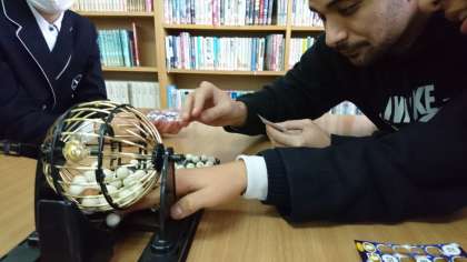 前半はCーnetのブラン先生とビンゴゲームをしました。皆スムーズに数字を英語で言いながら盛り上がりました。ブラン先生はsecond place(2位)でした。ビンゴカードの数字が全部そろうことを英語でblack out(ブラックアウト)と言うそうです。