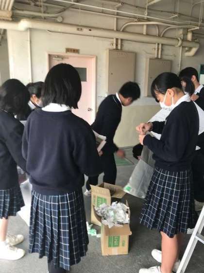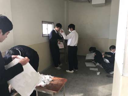 3年生は今日、大清掃をしました。写真は、校舎の壁にたくさん貼ってあった高校のポスターをはずして、片付けをしているところです。
