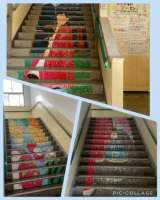 2年生の学年作品「階段アート」 アジアをテーマに国々のことを調べて 絵と新聞にま...